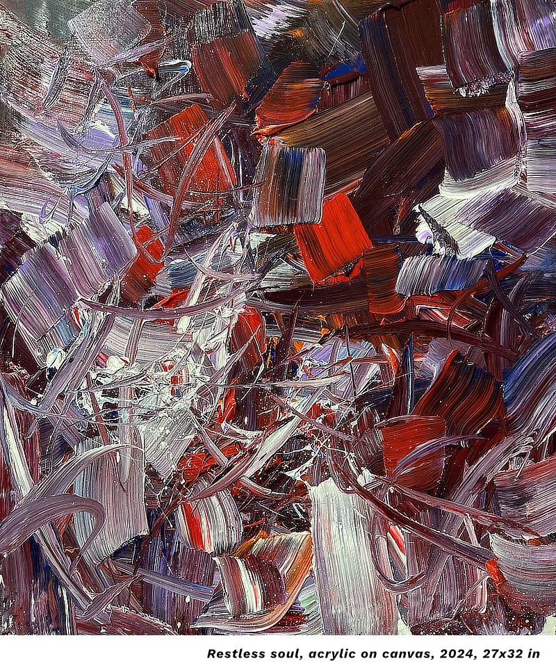 Abstraction gives me the freedom to express the rhythms, impulses, and fragments of thought that reside in my subconscious. I see abstract painting as a kind of symphony of the spirit—where color is melody, brushstroke is rhythm, and composition is harmony. It is a channel for deep emotion and a mirror of the self. Each piece is a dialogue with my inner world, a process of questioning who I am and where I come from.