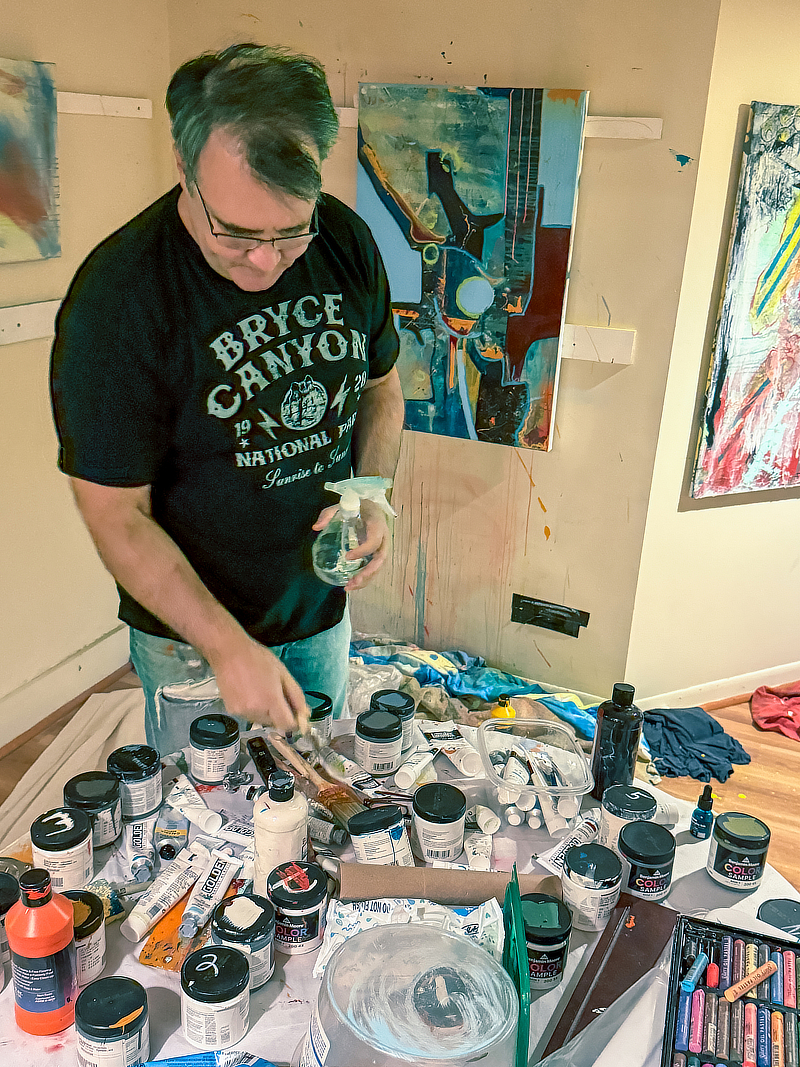 My studio is messy and chaotic, much like the times we are living in. Yet the art I create there, abstract and untethered, is where I make sense of it all… maybe even contain it.
